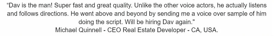 Däv's voice talents deliver performances which captivate and resonate, from a conversational guy-next-door in commercials, or an authentic inspirational speaker in explainer videos, to the commanding heroes and sinister villains in video games and animations plus everything in between. With his voice, Däv "paints" vocal narratives on the audio canvas with depth, conviction and authenticity, ensuring each project leaves a lasting impression on the listener.